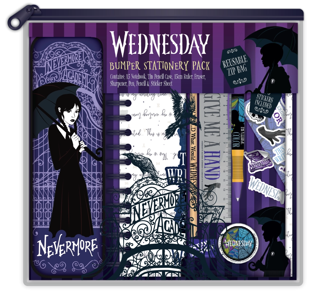 Siit leiad Wednesday nukud tema ikooniliste patsidega, Wednesday kollektsionääri figuurid, pehmed kaisukad, pusled ja lauamängud Nevermore’i motiividega, loovkomplektid ja ehituskomplektid fännidele. Wednesday kostüümid, maskid ja aksessuaarid toetavad kostüümmängu ja rollimänge; pusled, värvimisraamatud ja loovkomplektid arendavad peenmotoorikat ja kujutlusvõimet. Kõik on ametliku litsentsiga, vastupidavatest materjalidest ja pika kasutuseaga igapäevaseks mänguks.