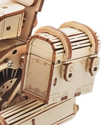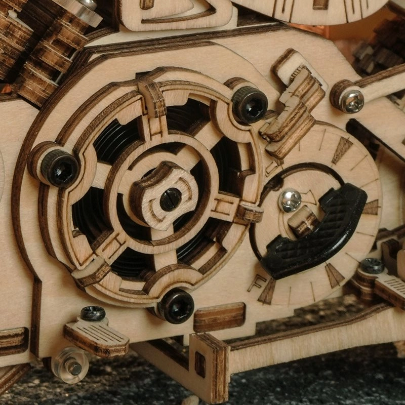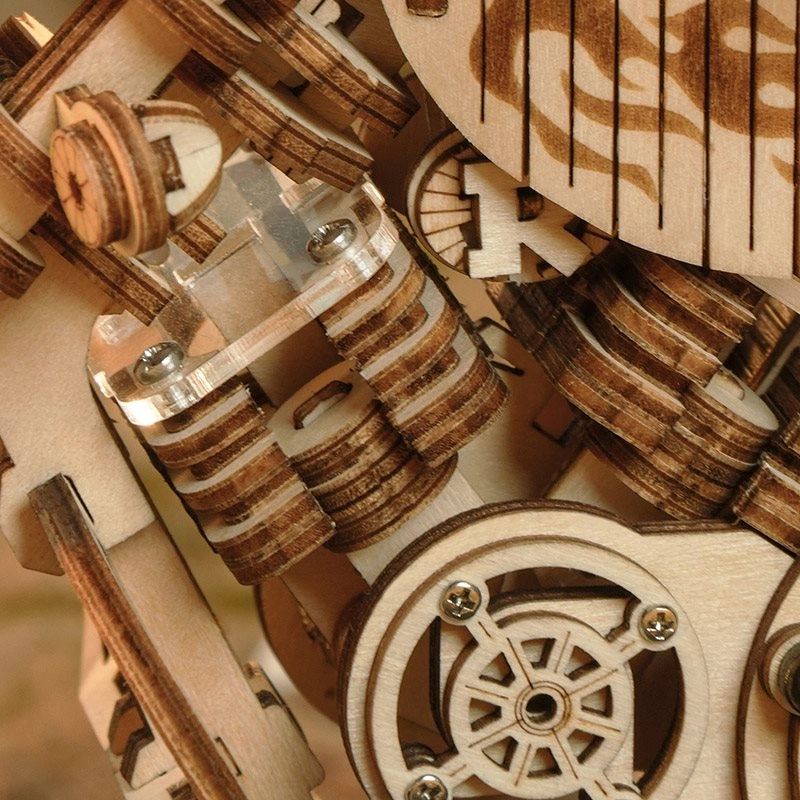 See puidust mehaaniline mootorratas on suurepärane valik kõigile, kes armastavad disaini, tehnikat ja korralikku käsitööd. Üleskeeratav vedrumehhanism koos päästikuga paneb mudeli hoogsalt liikuma, samas kui toimiv lenks võimaldab osalist suunajuhtimist. Realistlikku mootori tööd täiendab kaunilt kolbide liikumine ja esihargi toimiv vedrustus.