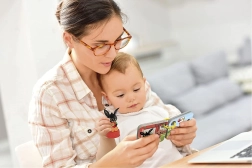 Väike pildiraamat (10 × 10 × 1,5 cm) toetab varajasi lugemisharjumusi ja kinnitub hõlpsalt vankri või koti külge.