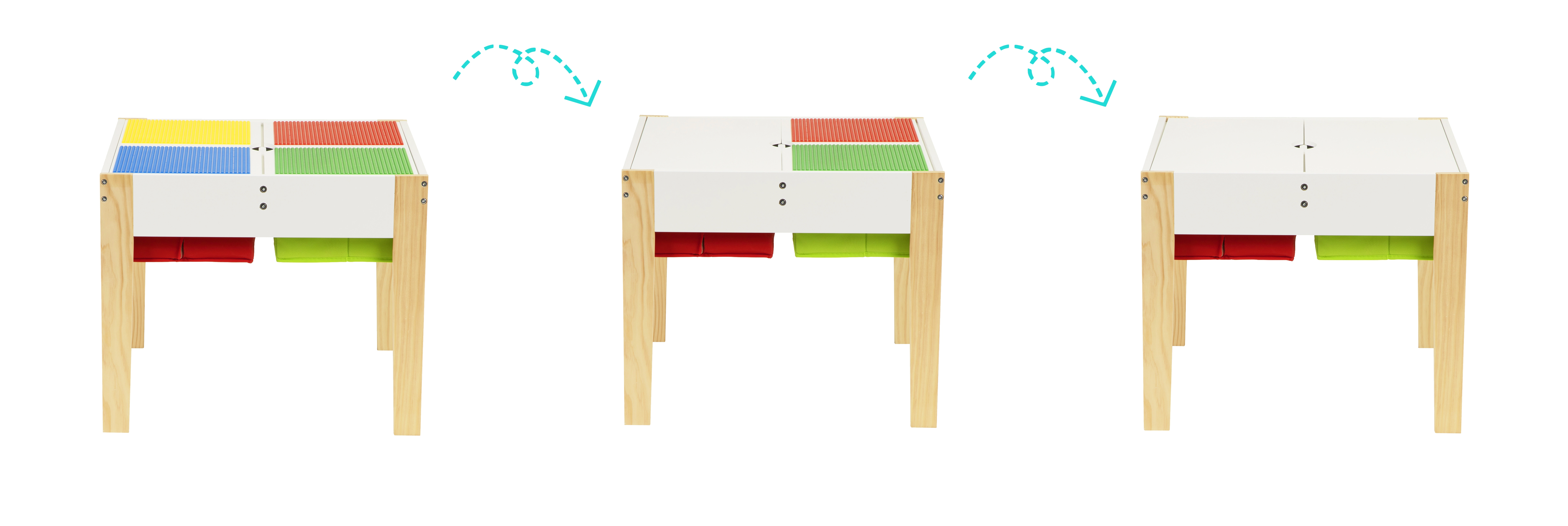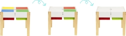 Kahes toonis, pööratav ja eemaldatav lauaplaat koosneb kahest osast: ühel poolel on klotsidega ühilduv pind, mis innustab loovalt ehitama, teisel poolel sile pind joonistamiseks, kirjutamiseks ja meisterdamiseks. Keskel asuvad 4 avarat korvi, kuhu lapsed saavad paigutada klotsid, pastellid, paberid ja raamatud – koristamine on vaid hetk.