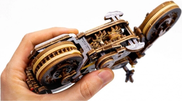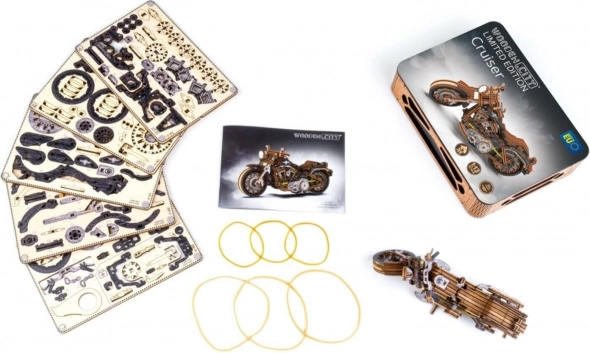 Puidust 3D pusle WOODEN CITY Cruiser V-Twin pakub autentset mehaanilise mudeli ehitamise kogemust ilma liimi või tööriistu kasutamata. See mudel on valmistatud keskkonnasõbralikust kasevineerist ning sisaldab pärismootorratta funktsionaalseid detaile. Mootorratta mudelil on: