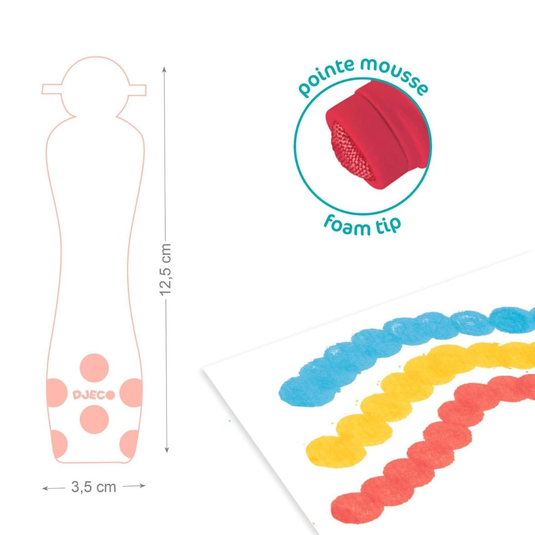 DJECO vahuvärvid koos praktilise käsna-aplikaatoriga on ideaalne valik esimeseks meisterdamiseks. Laps vajutab lihtsalt peale ja teeb täppe, tõmbeid ning mustreid – ilma pintslite ja segaduseta. Ergonoomiliselt kujundatud pudelid sobivad ka kõige pisematesse kätesse ja toetavad loomulikku haaret.