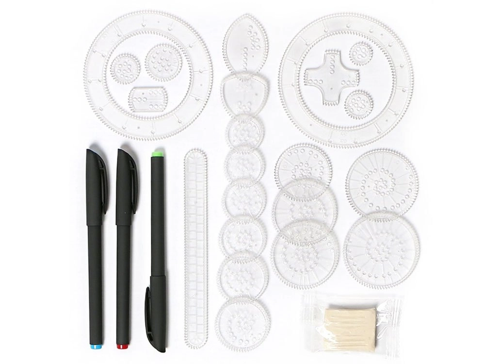 Läbipaistvad rattad ja joonlauad juhivad markeri sujuvalt üle paberi, luues täpseid, sümmeetrilisi spiraale ja lillelisi ornamente vähese vaevaga.