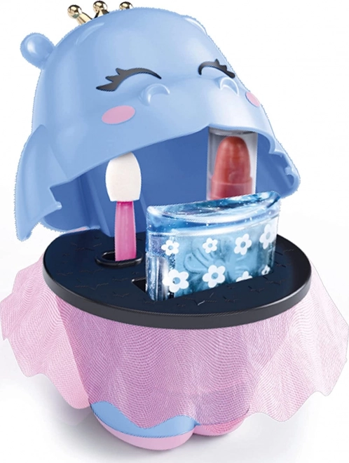 Jõehobu-kujuline karbike kuldse krooni ja roosa kangast seelikuga lisab meikimisele muinasjutulise puudutuse ning kaunistab iga lastetuba.