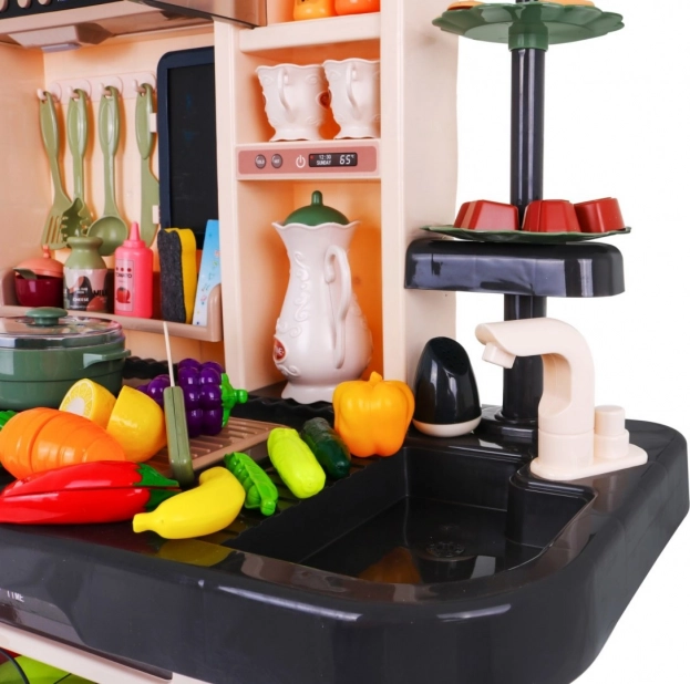 Köök on varustatud realistliku kraaniga, mis laseb tõepoolest vett läbi, pakkudes lastele ehtsat kokkamiskogemust.