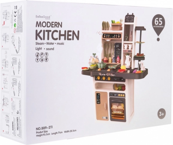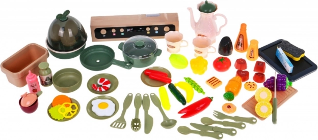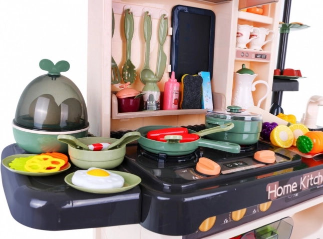 Lasteköök tuleb 65-osalise tarvikukomplektiga, sealhulgas efektidega munakeetjad, potid, pannid ning hulk plasttoite, nagu munad ja köögiviljad.
