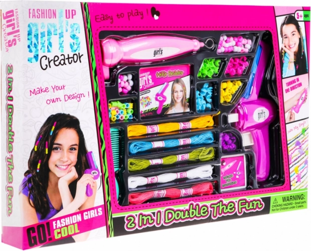 Komplektne varustus nii juuste kaunistamiseks kui ka käevõrude ja kaelakeede valmistamiseks – pärlid, rõngad, täheklotsid, nöörid, kamm ja praktilised tööriistad lihtsaks meisterdamiseks.