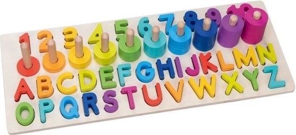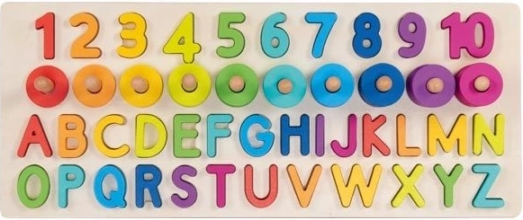 Meie pusle sisaldab 91 erinevat elementi, sealhulgas puidust alus, tähed (26 tk) ja numbrid 1–10 ning 55 värvilist rõngast. Lapsed saavad lihtsasti harjutada numbrite äratundmist ja liitmist ning moodustada lihtsaid sõnu.