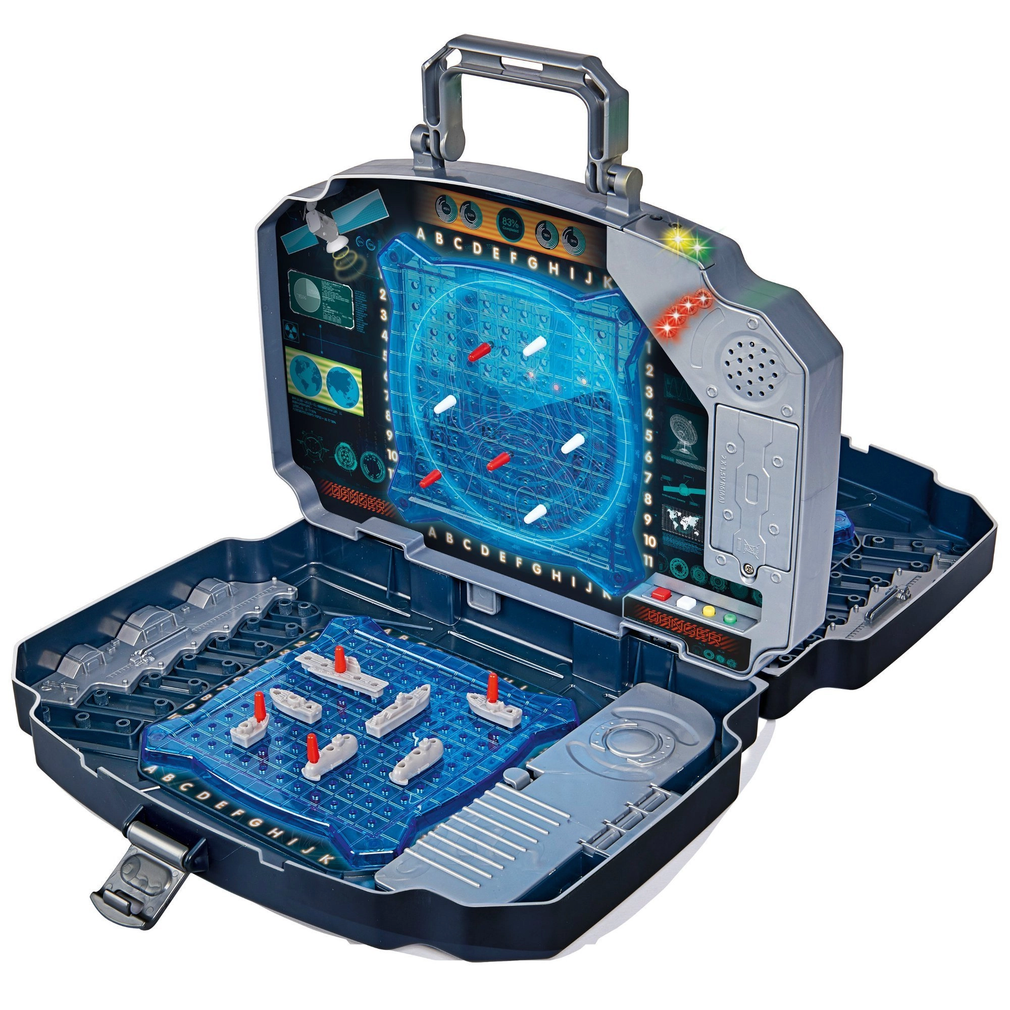 Nauti klassikalist Merelahingu mängu kaasaegses kuues. Tugev grafiiditooni kohver peidab kaks sinist mänguvõrgustikku laevade paigutamiseks ning keskpaneeli vastase pihta tehtud laskude märkimiseks. Integreeritud valgus- ja heliefektid annavad selge märguande nii tabamuse kui ka möödalasu kohta – mäng on ülevaatlik, pingeline ja lõbus kogu perele.