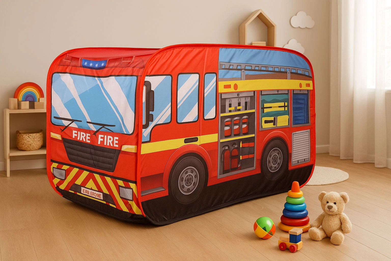 Stiilne lastetelk tuletõrjeauto kujul toob tunde mängulusti nii toas kui aias. Pakub kiiret pop-up püstitust, veekindlat põhja, tagumist sissepääsu ja avatavat katust veelgi loomingulisemaks mänguks. Kerge polüestrist konstruktsioon on lihtne kaasas kanda ja värvikad tuletõrjegraafikad rõõmustavad iga väikest kangelast.