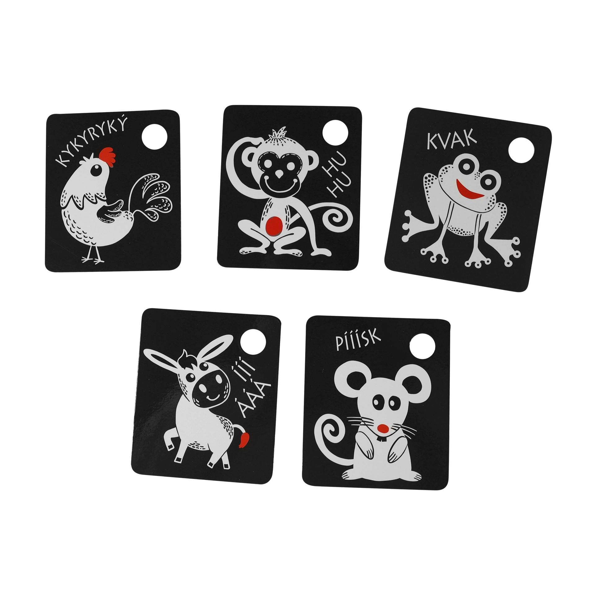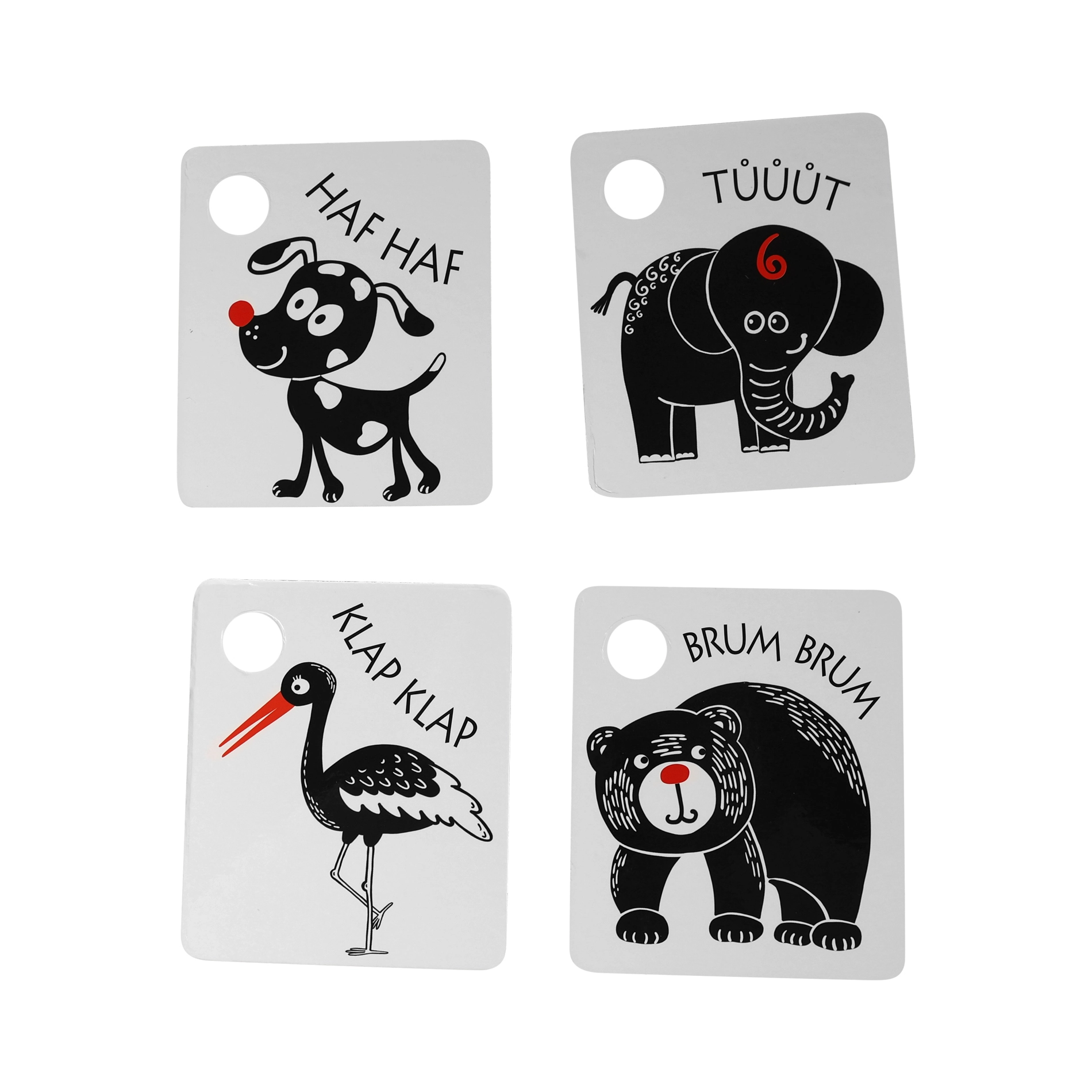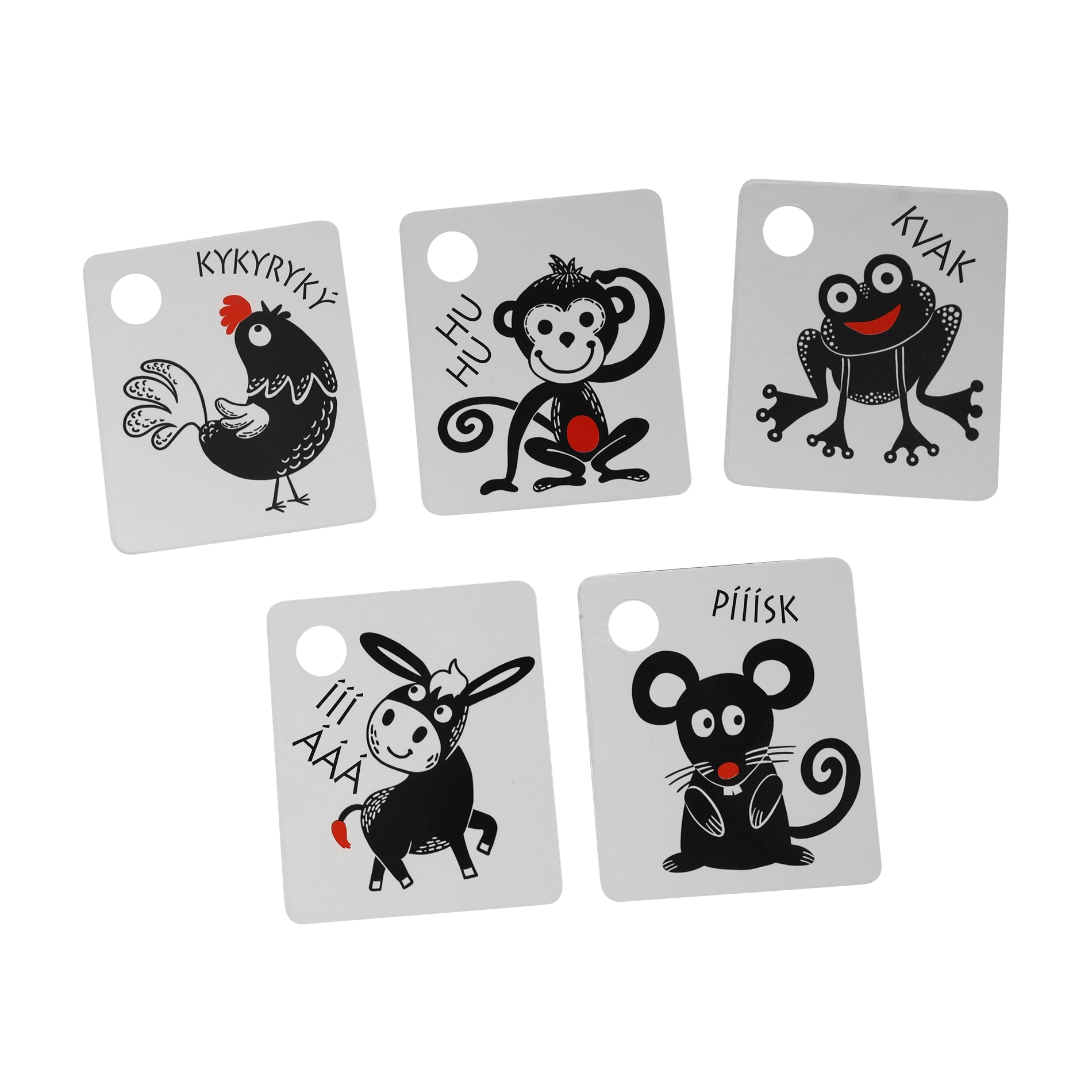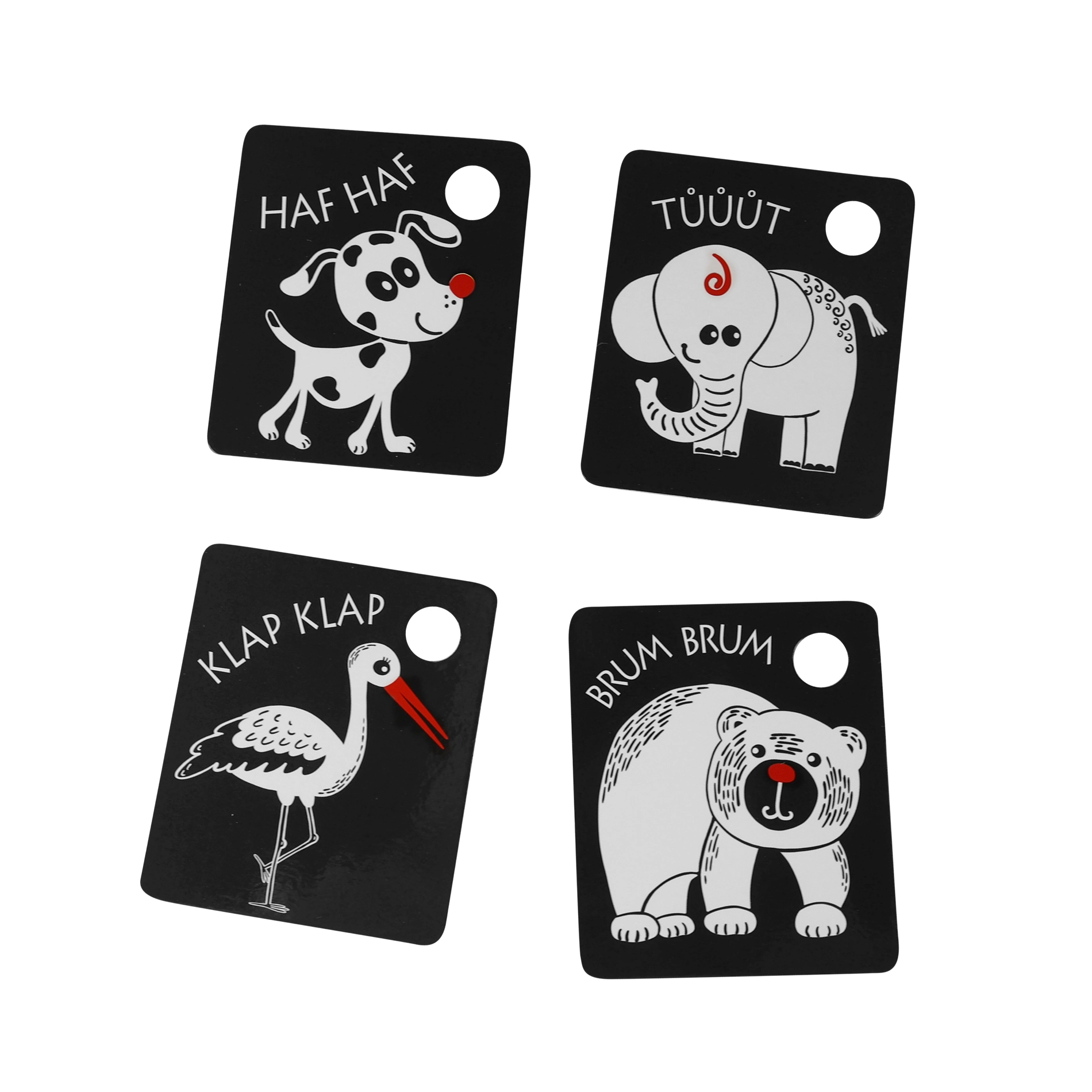 Igal kaardil on praktiline ava riputamiseks võrevoodi, vankri või mängukaare külge ning komplekti kuulub vastupidav plastist rõngas kogu komplekti lihtsaks ühendamiseks. Kvaliteetsed materjalid tagavad pika kasutusea ja ohutu kasutamise.
