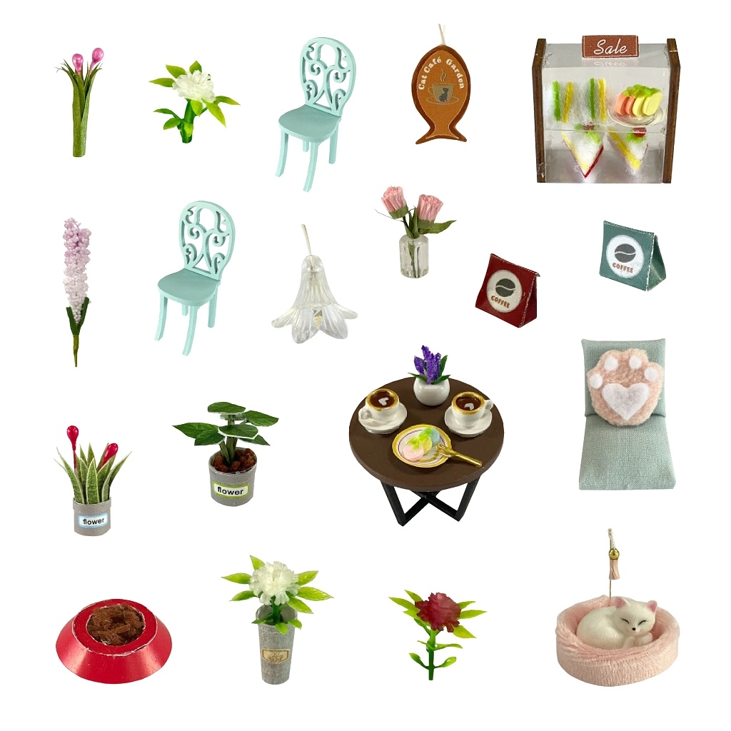 Miniatuurne mööbel, baar, lauakesed ja kassiteemalised kaunistused loovad autentse CAT & COFFEE meeleolu. Iga element on läbimõeldud ja värvilt kooskõlastatud.