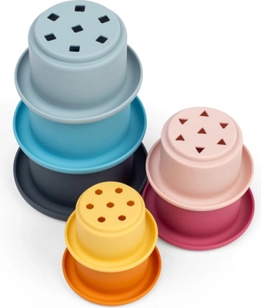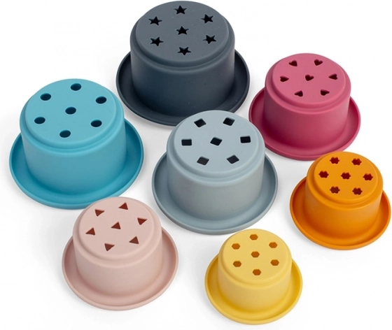 Värviline seitsmest virnastatavast topsist koosnev komplekt 100% toidusilikonist ilma plastita. Ideaalne vanni, liiva juurde ja tuppa. Musteravadega põhjad loovad koskefekti, lapsed arendavad peenmotoorikat, käe-silma koordineerimist ning värvide äratundmist. Materjal on vastupidav, mittetoksiline, lihtsasti puhastatav ja nõudepesumasinas pestav.