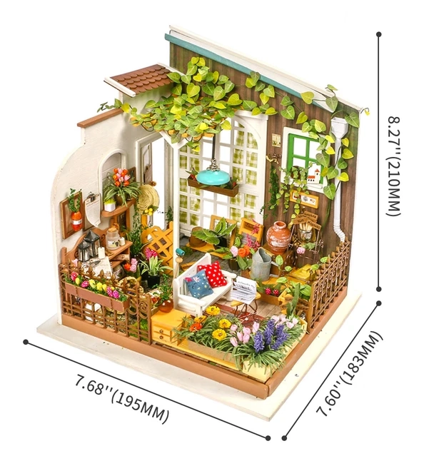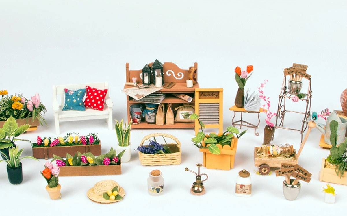Miniatuursed lilled, mööbel, padjad ja aksessuaarid loovad tõetruu aiaterrassi atmosfääri – ideaalne kui stiilne kodukaunistus.