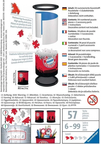 Armastatud kaubamärk RAVENSBURGER toob sinuni disainika 3D topsi klubimotiiviga FC Bayern München. Spetsiaalselt vormitud ja nummerdatud tugevast plastist tükid lukustuvad täpselt ning moodustavad stabiilse organiseerija, mis rõõmustab iga päev. Kokkupanekut saab teha kas motiivi järgi või lihtsama samm-sammulise kulgemise jaoks tagaküljel oleva nummerduse järgi.
