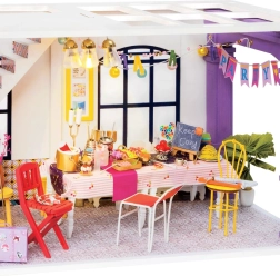 Miniatuur sisaldab detailseid elemente, nagu värvilised toolid, lauad ja muud dekoratsioonid, mis matkivad tõetruult päris interjööri.