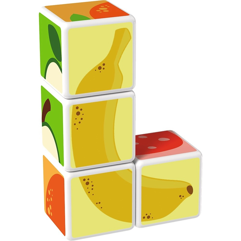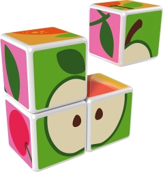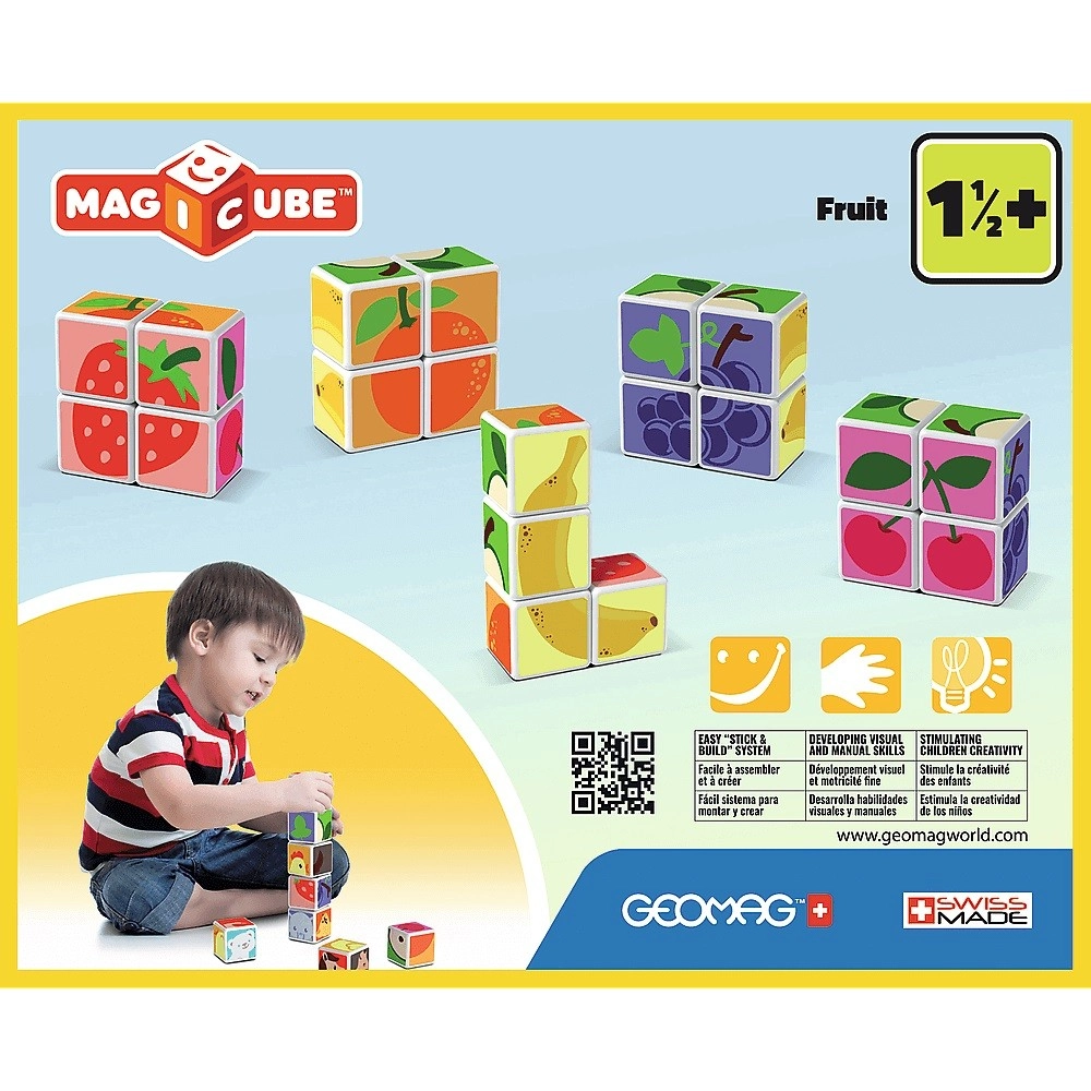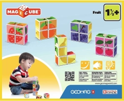 Geomag Magicube Puuviljad toob värvilised magnetklotsid illustratsioonidega õunast, maasikast, viinamarjadest, kirsist, banaanist ja teistest viljadest. Lapsed saavad kokku panna puuviljade pilte, aga ka lihtsaid 3D ehitisi nagu korsten või aedik. Klotside sees olevad magnetid tagavad lihtsa ühendamise ja mudelite stabiilsuse, muutes mängu intuitiivseks, lõbusaks ja frustreerimatuks.