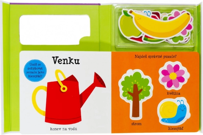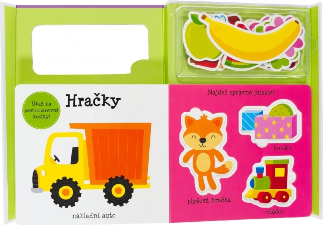 See komplekt on täiuslik valik väikestele lastele, kes õpivad uusi sõnu ja arendavad peenmotoorikat. Lõbusate illustratsioonidega raamat tutvustab lastele põhisõnu, värve, puuvilju ja loomi. Lisaks: