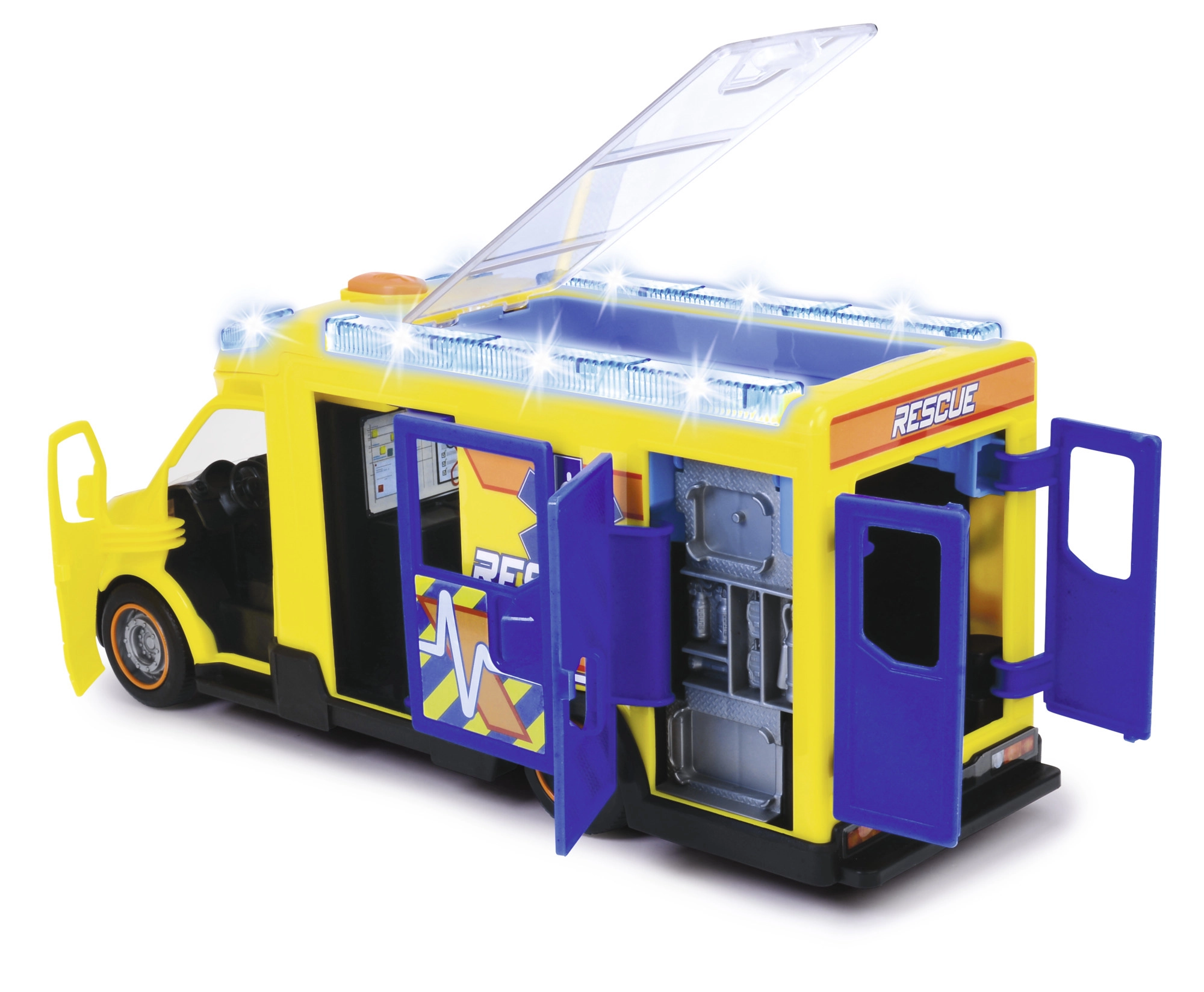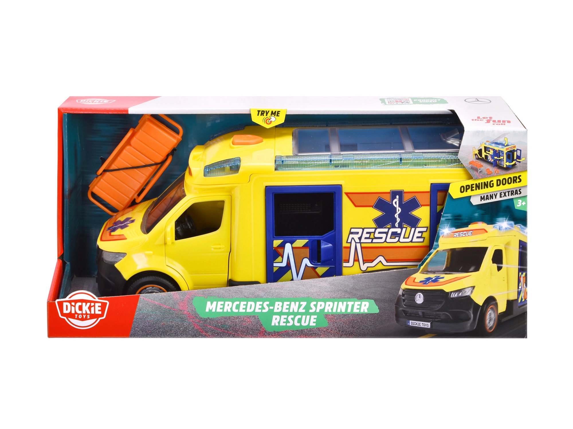 See Mercedes-Benz Sprinter Dickie Toysilt toob tõetruu päästekogemuse koos valguse ja heliga. Sõidukil on avatavad juhi-, kõrvaliste ja külg- ning tagauksed ning läbipaistev katus, mis annab ligipääsu detailsele interjöörile.