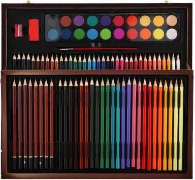 Avastage täielik kunstikomplekt, ideaalne nii väikestele kui ka suurematele loojatele. See praktiline komplekt elegantses puidust kohvris pakub kõike, mida on vaja maalimiseks ja joonistamiseks, sh värvipliiatseid, teritajat, kustukummi ja vesivärve – kokku 91 eset.