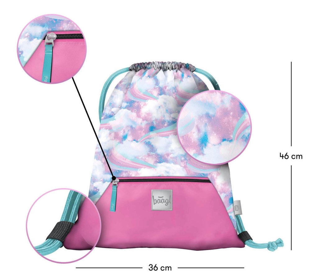 Lihtne ja kiire sulgemine, läbimõeldud jaotus ning taeva motiiv teevad sellest kotist suurepärase valiku igapäevaseks kasutamiseks koolis, huviringides ja reisidel.