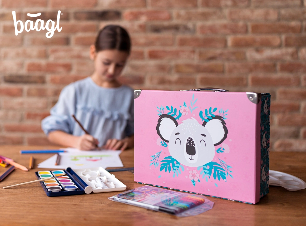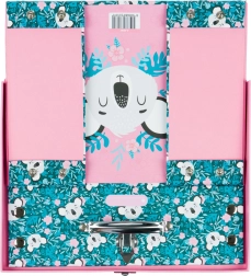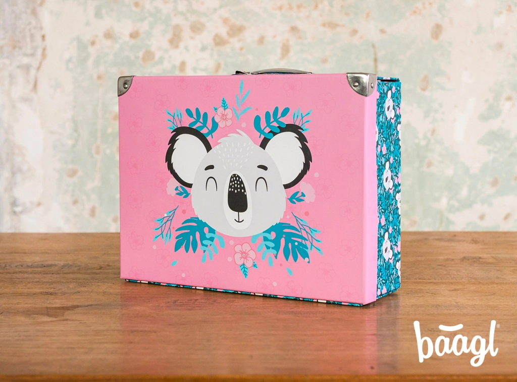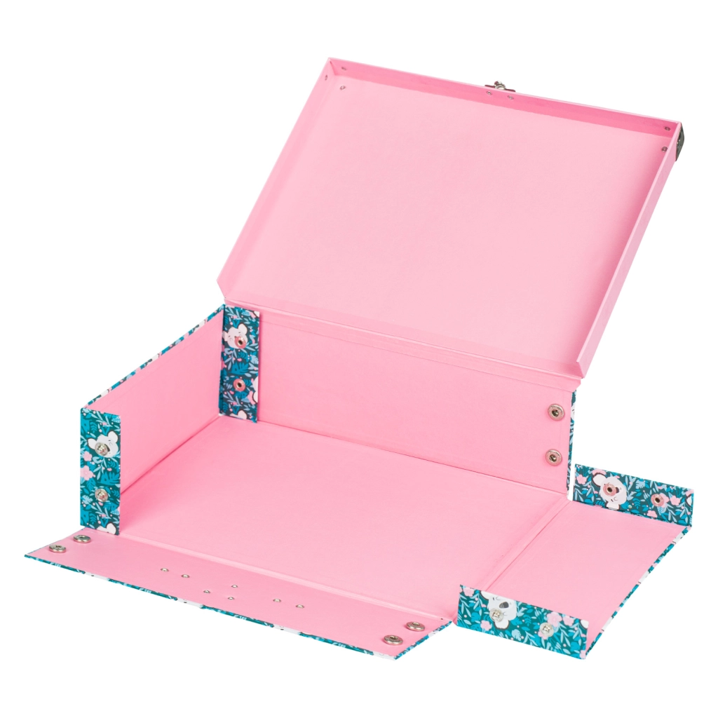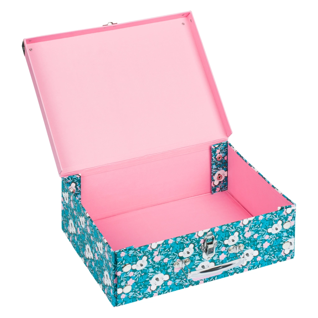 Kokkupandav koolikohver õrna koalamotiiviga sobib suurepäraselt kunstitarvete, vihikute, mänguasjade ja reisividinate jaoks. Elegantsed metallosad ja tugevdatud nurgad tagavad pika kasutusea, samas kui kerge konstruktsioon vastupidavast lamineeritud paberist teeb igapäevase kandmise lihtsaks.