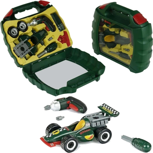 Laste võidusõiduauto ehituskomplekt praktilises kohvris koos litsentseeritud BOSCH Ixolino akukruvikeerajaga brändilt KLEIN pakub tunde loovat ajaviidet. Lapsed saavad auto turvaliste tööriistadega ise kokku panna ja sellega seejärel sõita. Komplektis on vahetatavad osad, suured rattad ja kleepsud välimuse viimistlemiseks. Arendab peenmotoorikat, toetab kujutlusvõimet ning tänu vastupidavale konstruktsioonile peab vastu igapäevasele mängule.