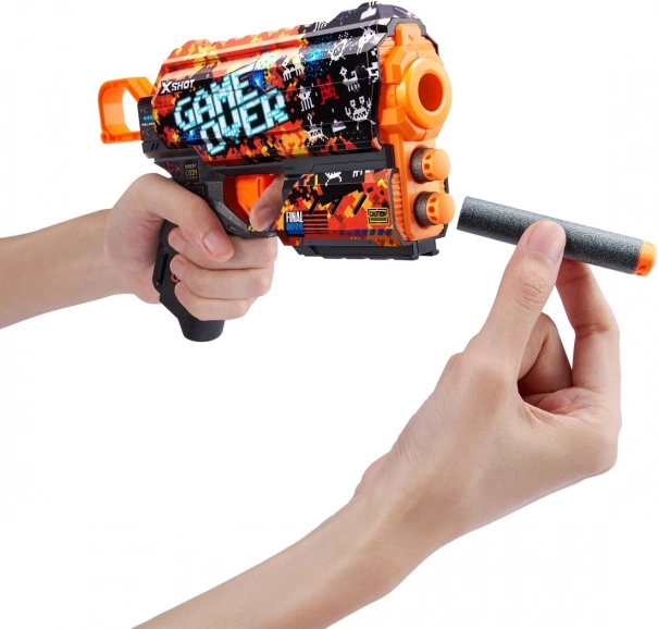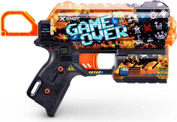 Avasta lõbu püstoliga X-Shot Skins Flux disainis Game Over. Tänu edasijõudnud trükitehnoloogiale paistab see silma erksate värvide ja mängulise esteetikaga, pakub lihtsat laadimist, esipoolset salvest 2 noolele ning laskeulatust kuni 27 meetrit. Pakendis on 8 vahunoole õhutaskutega suurema kiiruse ja täpsuse jaoks.