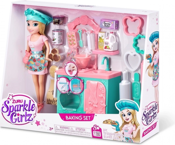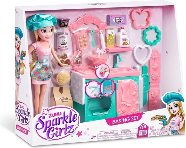 Komplektis on kõik vajalik mänguks, sh väikesed mängutoidud, kausid, spaatlid ja vormid, mis võimaldavad realistlikult küpsetamist jäljendada. Ava ahi, pane küpsised sisse ja mängi, nagu need küpseksid! Tänu vahetatavatele rõivastele saab nukku kombineerida teiste Sparkle Girlz sarja tegelastega.
