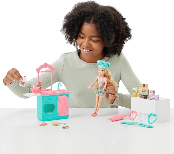 Sisaldab kõike, mida on vaja terviklikuks küpsetamismänguks, sh nukk, mängutoidud ja köögitarvikud.