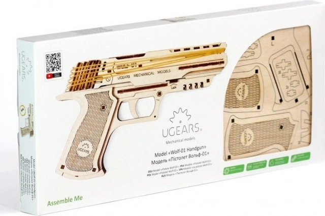 UGEARS Wolf-01 on detailne puidust püstoli replika kummipaelajamiga, mille paned kokku ilma liimita vaid täpselt väljalõigatud detailide abil. Valmismudel on toimiv mehaaniline seade, mis laseb usaldusväärselt kummipaelu ning näitab praktikas, kuidas töötavad koos hammasrattad, päästikumehhanism ja materjalide elastsus.