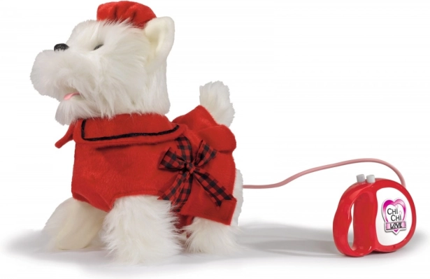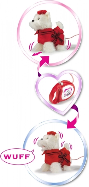 Interaktiivne plüüšist West Highlandi terjer CHI CHI LOVE Poshi on loodud väikestele loomaarmastajatele. Stiilne punane komplekt lipsuga annab koerale šarmi ning jalutusrihma ergonoomiline käepide tagab mugava juhtimise. Tänu kaabliühendusele reageerib koer kindlalt käskudele – ta oskab kõndida, haukuda ja sabaga liputada.