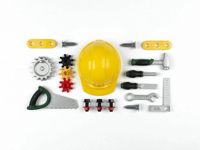 - Komplekti sisu (20 osa): tööpink, kollane kiiver reguleeritava kinnitusega, saag, haamer, kruvikeeraja, mutrivõti, viil, nihik, 12 ehituselementi (kruvid, naelad, hammasrattad jms).