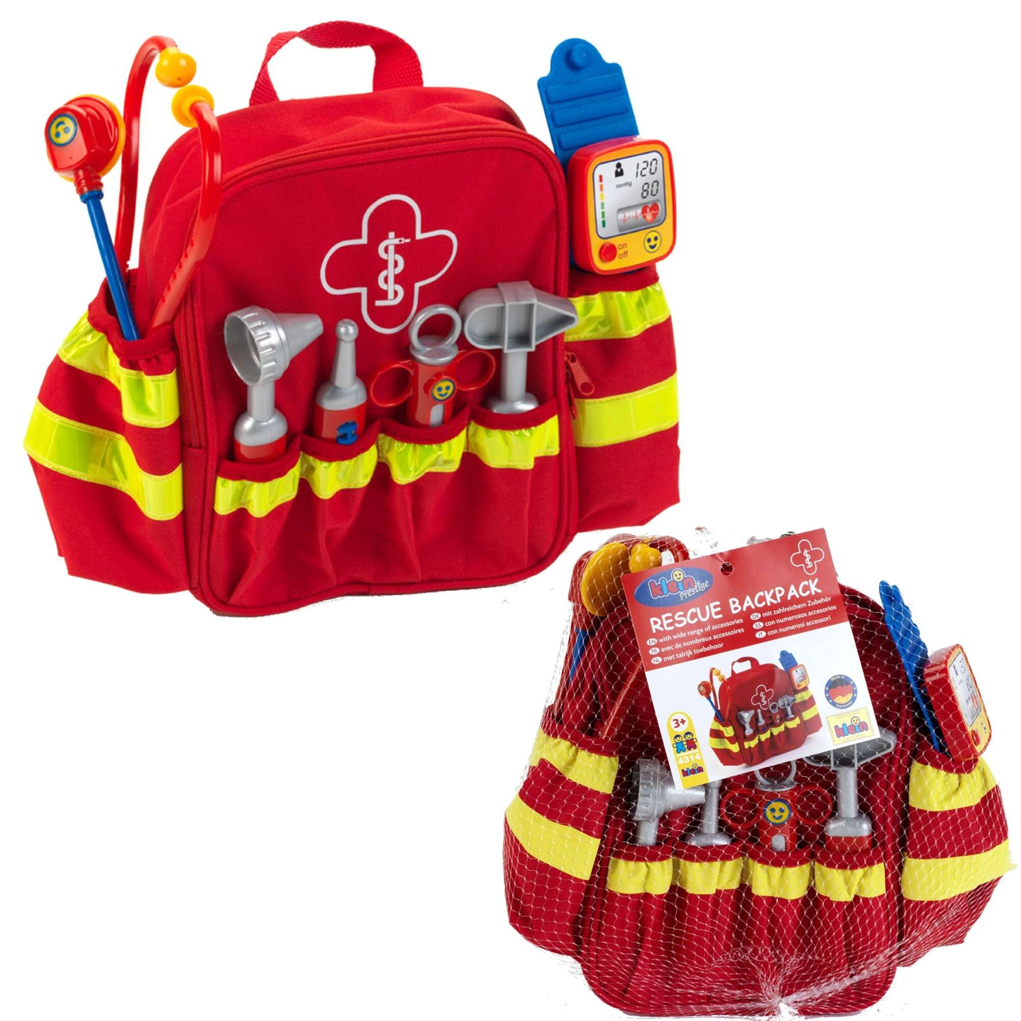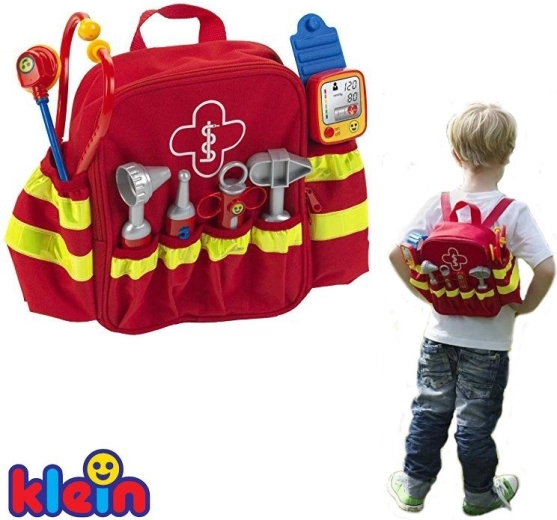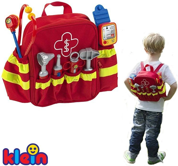 Komplekti kuulub kuus klassikalist „kabineti” tööriista: stetoskoop südame kuulamiseks, otoskoop kõrvadele, termomeeter, refleksvasar, süstal ja vererõhumõõtja. Kvaliteetne teostus ja siledad servad tagavad, et mäng on turvaline lastele alates 3. eluaastast. Tänu reguleeritavatele õlarihmadele sobitub seljakott mugavalt enamikele eelkooliealistele.