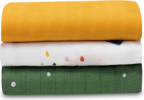 Kolm 70 × 70 cm suurust mähet erinevate motiividega igapäevaseks kasutuseks – jalutuskäru jaoks, imetamiseks, mähkmevahetuseks või kergeks tekiks.