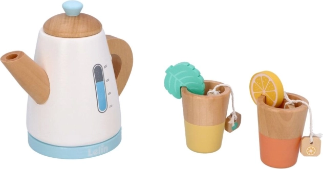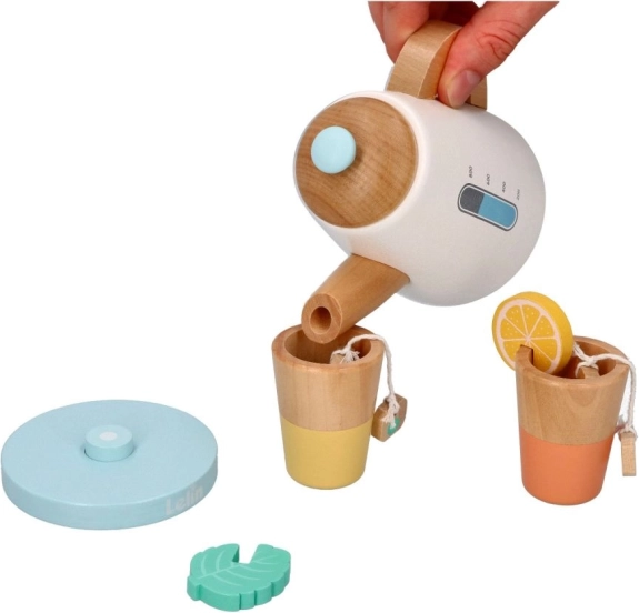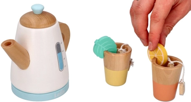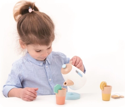 Aidake lastel arendada nende sotsiaalseid ja motoorseid oskusi puidust teekomplektiga, mis on ideaalne kujutlusmänguks. Sobib lastele alates 3. eluaastast; komplekt sisaldab kannu ja tasse, mis on kujundatud looduslikes ja pastelltoonides meeldiva välimuse saavutamiseks. Looge oma teelaudu ja lõbusaid hetki sõprade või perega.
