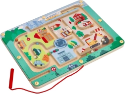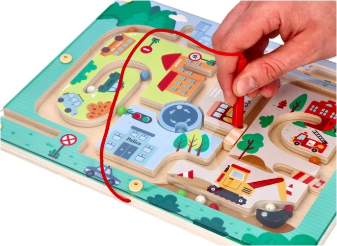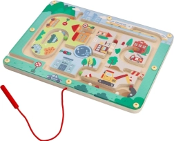 Avastage lõbus maailm mänguga Magnetiline labürint Sõidukid, mis on loodud väikeste käte mõtlemist ja osavust ergutama. Mänguasi on valmistatud kvaliteetsest puidust ning kujutab kirevat linnastseeni teede, hoonete ja sõidukitega. Punase magnetpulga abil juhivad lapsed väikseid kuulikesi mööda radu, mis toetab nende manuaalseid oskusi ja käe-silma koordinatsiooni.