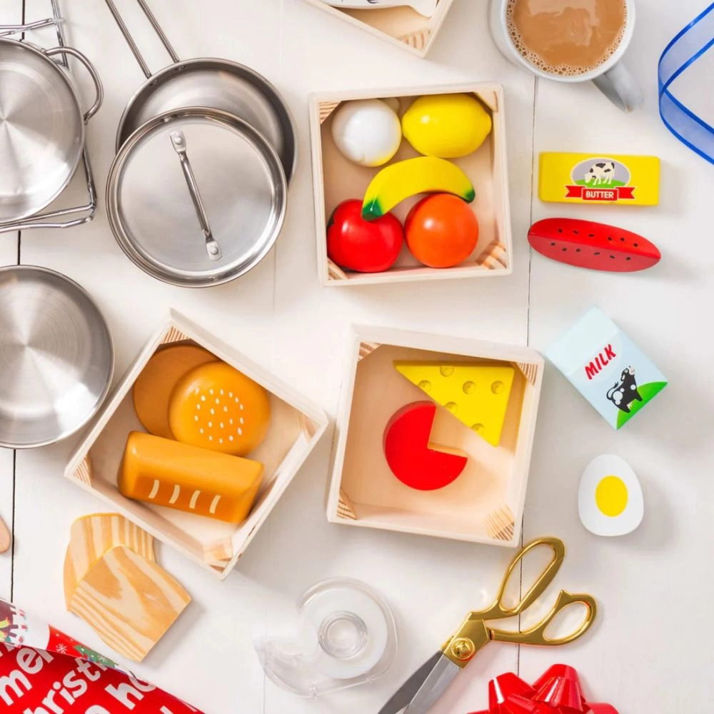 See puidust toiduainete komplekt sisaldab nelja väikest karpi, milles on erinevad toiduained nagu piim, juust ja leib. See on loodud loovaks mänguks, mis aitab lastel arendada peenmotoorikat ja kujutlusvõimet.