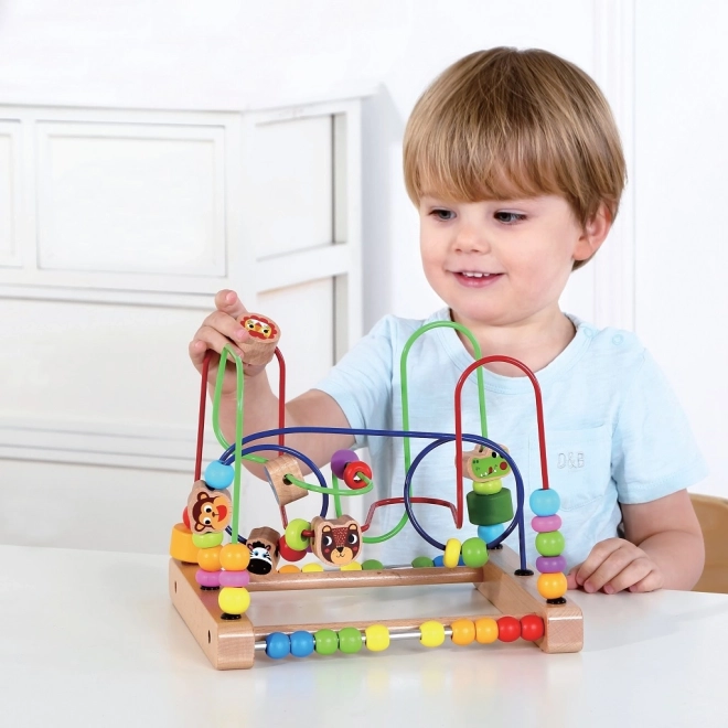 Puidust loomadega labürint on ideaalne mänguasi väikestele avastajatele alates 18. elukuust. Tänu kirevatele helmestele ja armsatele loomategelastele arendavad lapsed mänguliselt silma-käe koordineerimist ning õpivad eristama värve ja kujundeid. Helmestega mängimine toetab ühtlasi esimesi samme loendamise suunas ja arendab loomulikul teel loogilist mõtlemist.