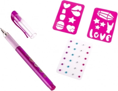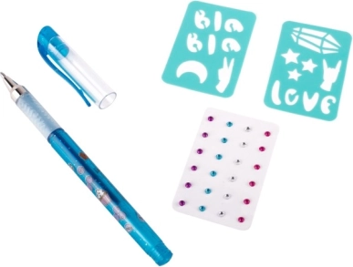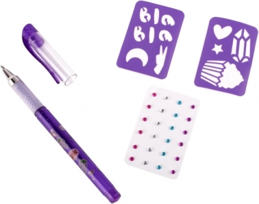 - 1 lõhnav geelpliiats 3 värviga, 2 šablooni, isekleepuvad sädelevad kivikesed