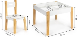 Suurepärane komplekt teie lapsele, mis oma lihtsa vormi tõttu sobib ideaalselt igasse lastetuppa. Laud on männjalgadega, mis tagavad stabiilsuse, ning MDF-plaadiga, mis on lihtsasti hooldatav ja vastupidav kahjustustele.