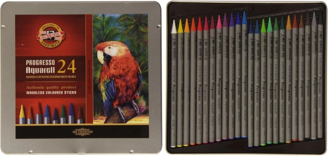 KOH-I-NOORi Progresso Aquarell kunstipliiatsite komplekt pakub 24 pliiatsit elegantses metallkarbis, ideaalne nii alustavatele kui ka kogenud kunstnikele.
