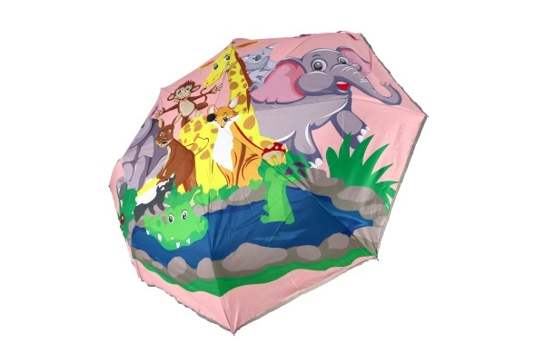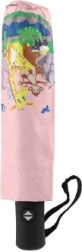 Vihmavarjul on värviline loomamustriga trükk roosal taustal, mis lisab igale vihmakõnnile rõõmsat ja mängulist võlu.