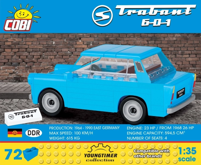 Trabant 601 on üks tuntumaid Ida-Euroopa autosid. COBI komplekt mõõtkavas 1:35 toob esile selle tüüpilised jooned ning võimaldab väiksemaid kohandusi ja modifikatsioone. Mudel näeb riiulil suurepärane välja ning pakub samal ajal lõbusat ehitamist nii lastele kui täiskasvanutele.