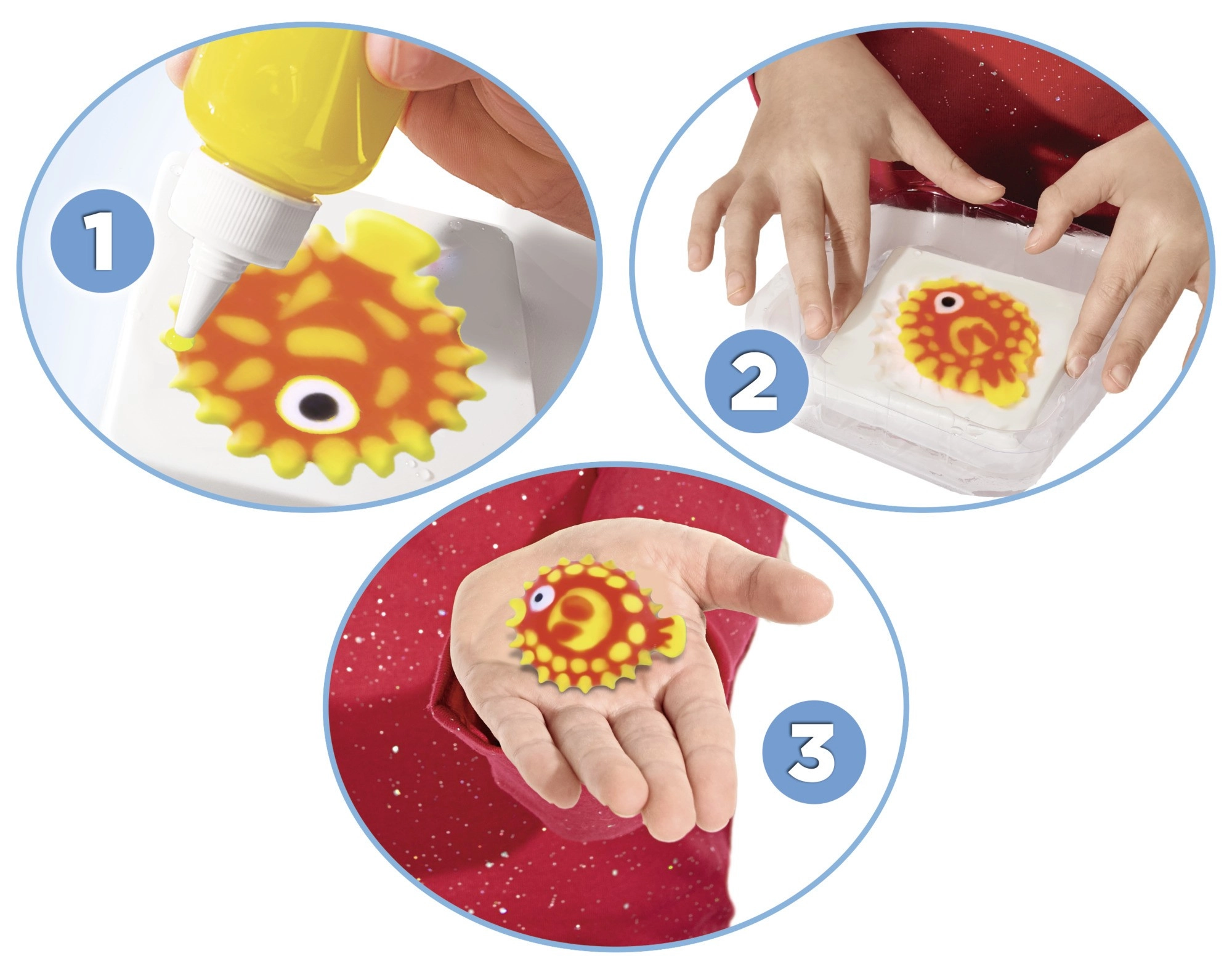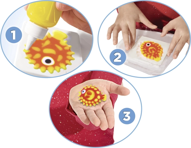 Pärast täidetud vormi kastmist ettevalmistatud lahusesse muutub geel mõne sekundiga pehmeks 3D kujukeseks, mis tõuseb ise pinnale ja on valmis mänguks.