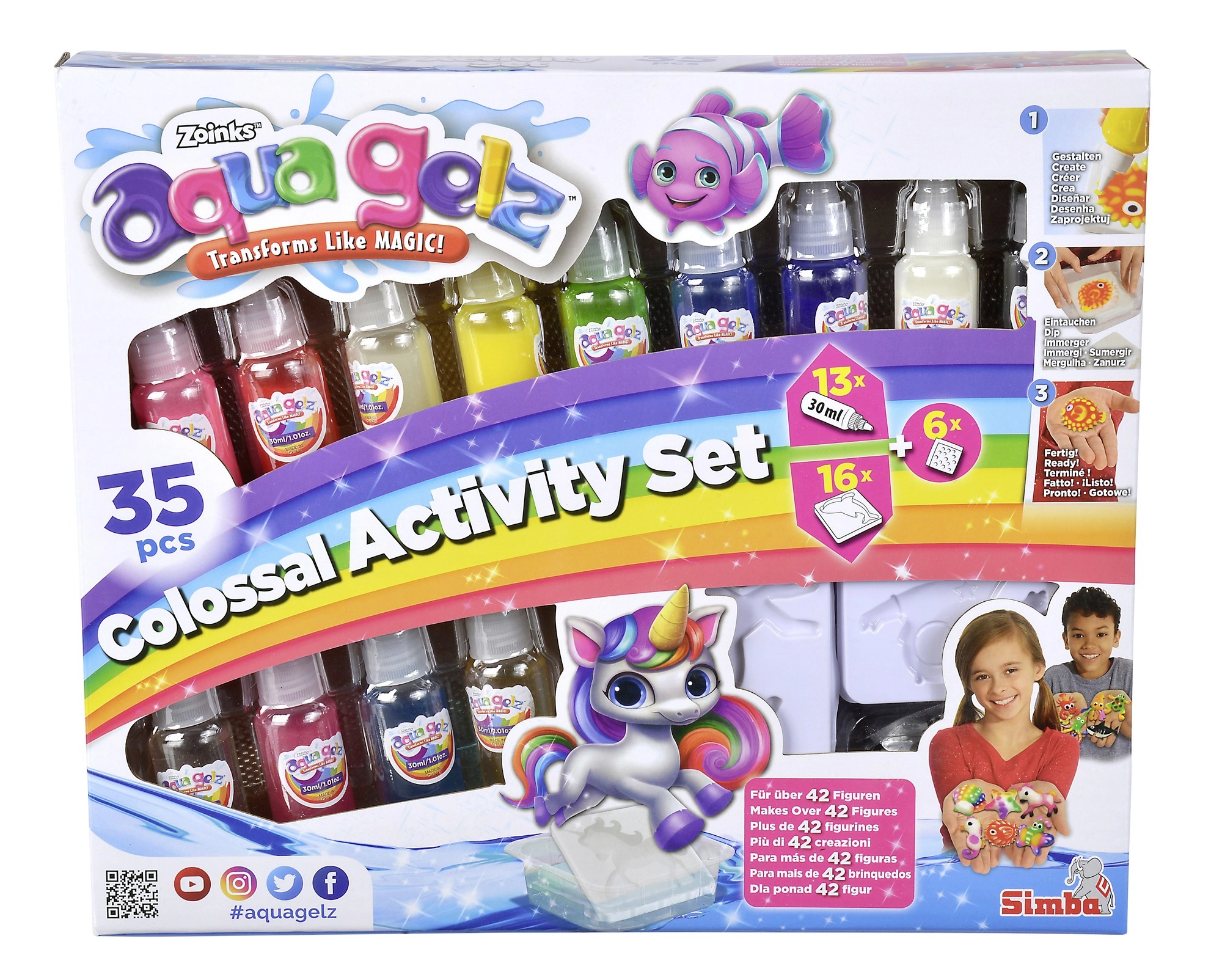 Avasta lõbus meisterdamine komplektiga Aqua Gelz – loo minutitega pehmed 3D tegelased värvilistest geeleidest. Piisab, kui valmistad maagilise lahuse vees, täidad vormid värvigeeliga ja kastad need vette. Kujukesed ellu ärkavad vees ja on kohe mänguks valmis. Komplektis on 13 geelivärvi, 16 vormi ning stardiks vajalikud lahusepakikesed.