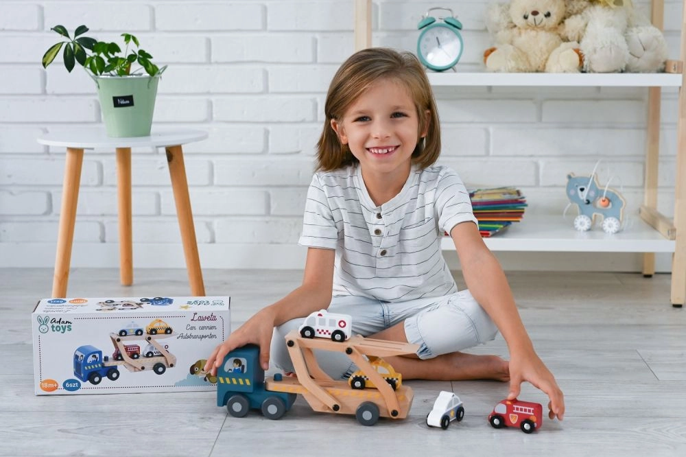 See puidust autovedaja pakub tänu oma mitmekülgsusele ja kvaliteetsele teostusele lastele suurepärast meelelahutust. Komplektis on eemaldatav haagis, mis mahutab neli armsalt värvitud puidust sõidukit.