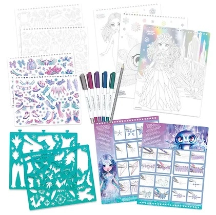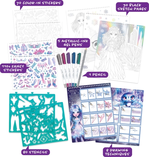 Komplekti kuuluvad rikkalikud lisad: metallik-geelpastapliiatsid efektsete detailide loomiseks, plastikšabloonid täpsete kontuuride jaoks, kleepsud (sh värvitavad) ning visandamiseks pliiats. Temaatilised lehed tegelasega Iceana kutsuvad värvima, kaunistama ja oma illustratsioone kujundama.