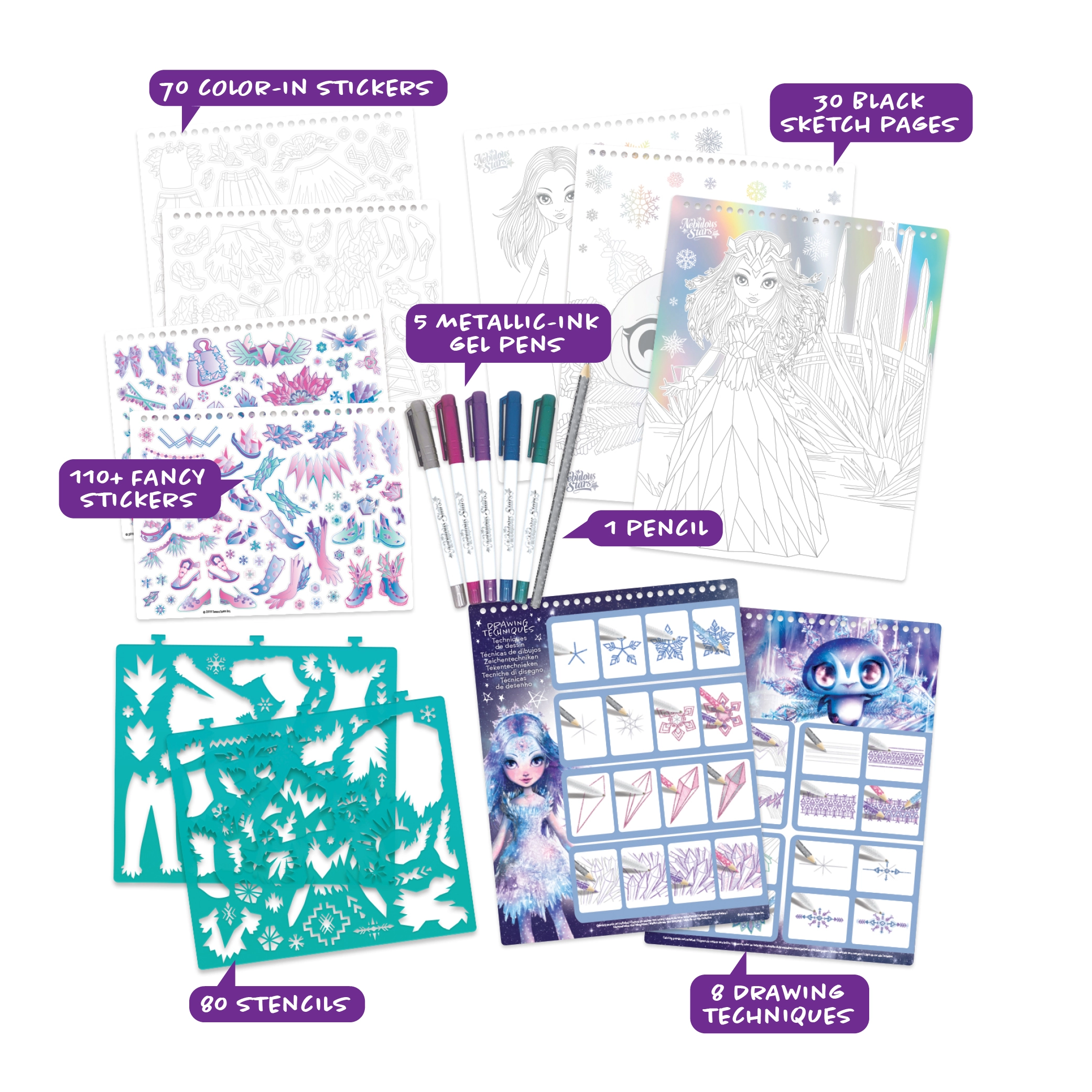 Pakendis on kõik, mida lapsed vajavad: 80 šablooni, 5 metallik-geelpastapliiatsit, pliiats, 30 lehte ja hulgaliselt kleepsusid. Midagi pole vaja juurde osta.