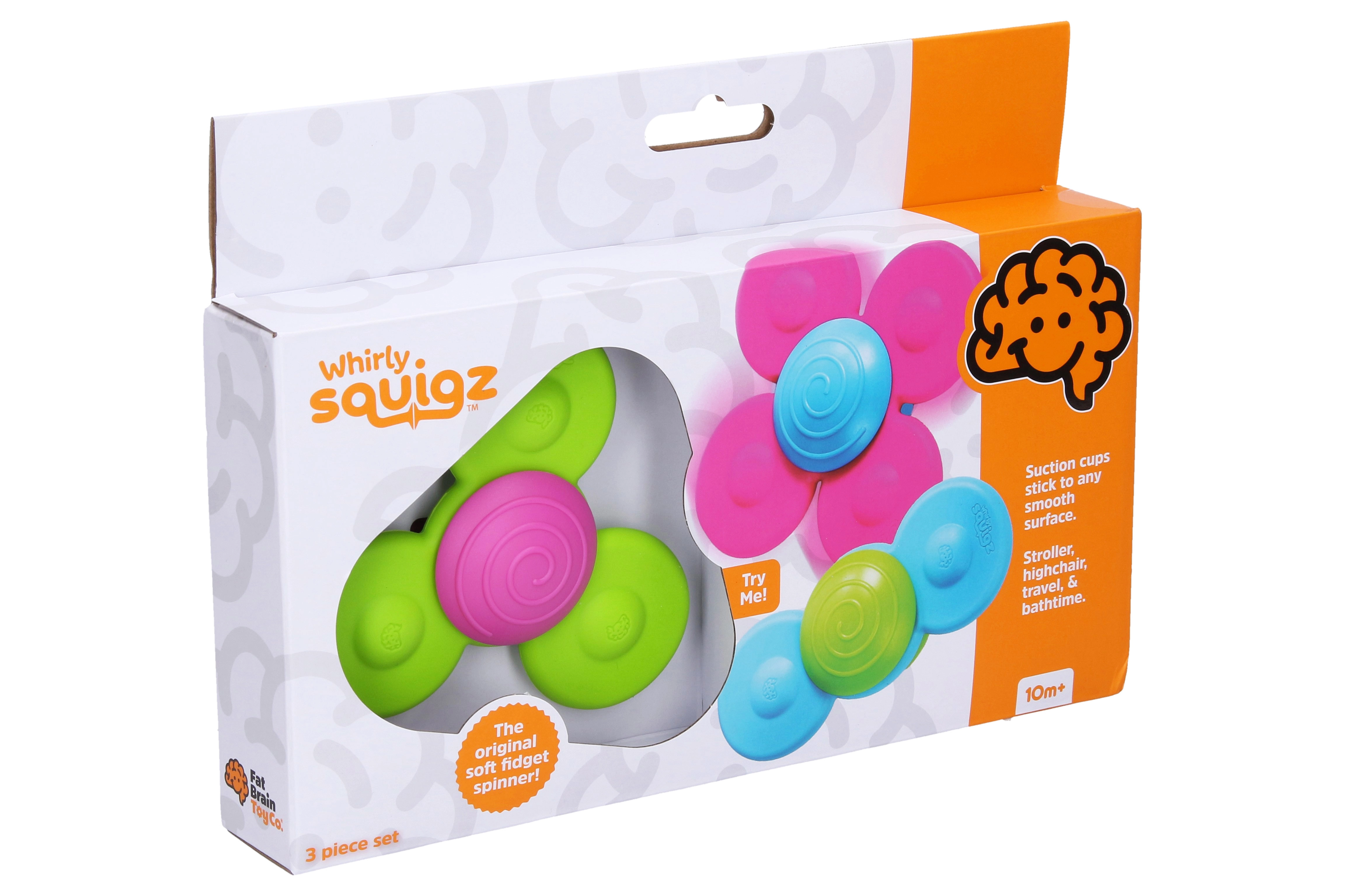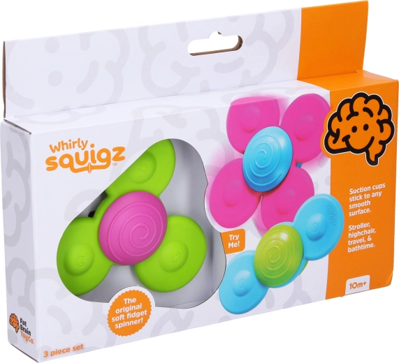 WHIRLY SQUIGZ komplektis on kolm eri kujuga spinnerit iminappadega, mis kinnituvad kindlalt igale siledale pinnale – akendest ja plaatidest kuni vanni servani. Vaja on vaid õrnalt puudutada ning spinnerid hakkavad pöörlema, pakkudes lastele visuaalset ja taktiilset stimulatsiooni ning rahustavat meeleelamust.